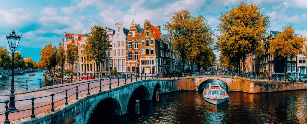 Panorama of Amsterdam. Famous canals und bridges at warm afternoon light. Netherlands